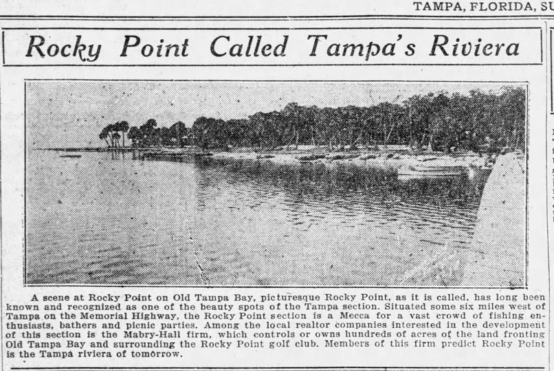In 1925, Tampa realtors predicted that Rocky Point would soon become Tampa’s Riviera, because of its natural beauty and its convenient location – approximately six miles from the downtown Tampa business district. Tampa Sunday Tribune, May 31, 1925