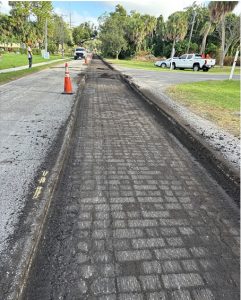 Today, Dana Shores Drive primarily serves the residential communities of Dana Shores, Pelican Island, and The Cove along with visitors to Rocky Point Golf Course and Skyway Sports Complex. Those who travel along this roadway also travel across history. Just six inches below the asphalt lies segments of the original road laid in brick in the early 1900s. Recently, in October 2025, roadway resurfacing crews unearthed a portion of the original brick roadway near the main entrance to the Rocky Point Golf Course Clubhouse. (Special thanks to Preston Ross, CEI Sr. Inspector, for sharing this picture with us.)